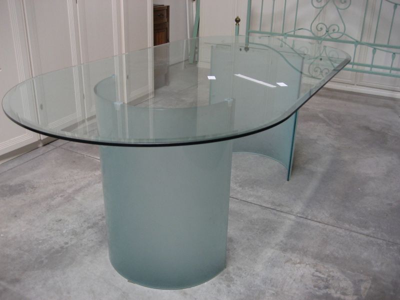 - Tavolo in cristallo molato di circa 2 mt. con supporti satinati, composto da soli tre elementi. Bellissimo per sala da pranzo-sala riunioni ma anche come tavolo centrale per negozio. Presenta una piccola scheggiatura su un angolo del basamento, per la quale è già stato ribassato di valore di 200 euro. Fatturabile