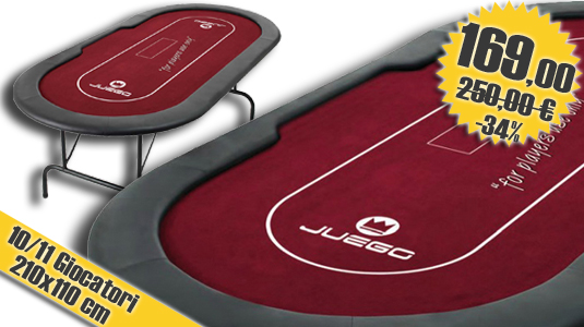 - Tavolo Ovale in legno con panno Serigrafato, fino a 10 giocatori. Completo di bordo imbottito. Struttura metallica di sostegno con gambe pieghevoli. Grande qualità ad un prezzo bassissimo! Caratteristiche Prodotto: Dimensioni: 210 x 110 x 78 cm circa Peso: 40 kg circa Piano di Gioco: Panno rosso serigrafato JUEGO Supporto: Struttura di rinforzo e gambe pieghevoli Bordo Imbottito: Rivestito in ecopelle nera Posti: 11 giocatori o 10 giocatori + 1 Dealer Cover per Tavoli da Poker Ovali Universale (non inclusa) Visita il nostro Negozio online PokerManiaShop.com, il 1° in Italia ed Europa dedito a tutti i giochi da Tavolo per adulti e Bambini..e non solo...