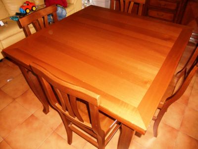 - Tavolo apertura a libro impiallacciato in noce tinto scuro, ottimo stato. Misure (chiuso): 105 x 105 Misure (aperto): 210 x 105 4 sedie in noce tinto scuro; sedile in massello. Ottimo stato. Euro 600,00 Possibilità di avere 4 sedie in più ad € 160,00. 339-5389664