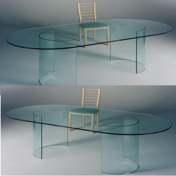 - Tavolo Riunioni Ufficio Glass 2 basi elittiche in vetro curvato temperato trasparente spessore 1,2 cm. Piano in vetro stondato forma elittica temperato trasparente spessore 1,2 cm. Dimensioni.: L. 260 x P. 100 x H 72