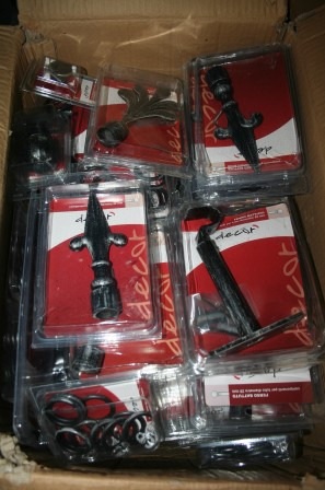 • Lotto bastoni ed accessori per tende tutto in ferro battuto: bastoni, finali, supporti, anelli, rosette, pomoli, ganci ferma tende, ecc. totale: 3.500 pezzi  assortiti in modelli e misure