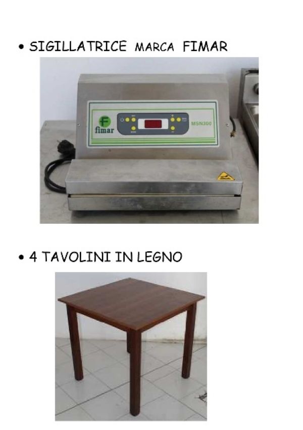 - Nuova vendita fallimentare di attrezzature da ristorante usate: bollitore 2 cestelli con doppia piastra e friggitrice marca MBM, vetrina gelato marca Gaggioli, lavastoviglie marca Omniwash, sigillatrice marca Fimar, 4 tavoli in legno, tritacarne marca Bizerba, 6 bilance marca Bizerba, scalda tazzine. Per informazioni, appuntamento visione beni e trattative contattare il Sig. Bobbi Luca al 328/8535881 o ufficio 0744/800948