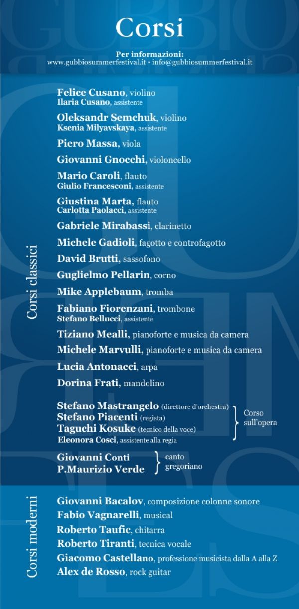 - Da venticinque anni il Gubbio Summer Festival contribuisce a scandire e ad impreziosire la stagione estiva eugubina e del comprensorio. Il radicamento nel territorio, l’attenzione alla formazione, la qualità dei concerti sono le peculiarità vincenti del cartellone. Durante il festival, alcuni dei luoghi più caratteristici della Città storica si popolano di musicisti ed appassionati, e le note pervadono curiose le vie e i vicoli vicini, strappando emozioni e regalando splendide serate estive. Sempre più ampia la platea dei partecipanti da tutto il mondo, che tornano a Gubbio e ne carpiscono nei giorni di stage le bellezze e l’autenticità; sempre più vasta l’offerta di genere. E’ con tali fattezze che si manifesta la cultura, quella cui tanto teniamo: non semplice evento, contingente e fine a sé stesso, non vezzo virtuosistico di qualche talentuoso, ma processo: di intrattenimento, di crescita, di conoscenza.