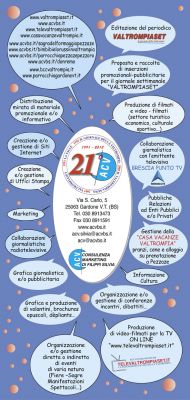 - LA ACV - VALTROMPIASET CERCA PROCACCIATORI DI INSERZIONI PUBBLICITARIE (DI QUALSIASI ETA') PER LOCANDINE EVENTI E MANIFESTAZIONI IN VALTROMPIA E PER SPECIALI GIORNALISTICI SUL VALTROMPIASET - IL GIORNALE DELLA VALTROMPIA. E' NECESSARIA LA OPERATIVITA' IN VALTROMPIA - LUMEZZANE - BRESCIA. LA COLLABORAZIONE PUO' ESSERE A TEMPO PARZIALE, TEMPO LIBERO, TEMPO PIENO ... RIMBORSI SPESE E/O PROVVIGIONI DA CONCORDARE . INFO: www.valtrompiaset.it - www.acvbs.it - www.televaltrompiaset.it - www.casavacanzevaltrompia.it PER CONTATTI. 030 8913473