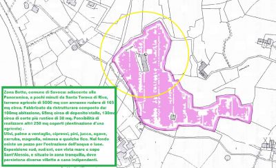 - Zona Botte, comune di Savoca: adiacente alla Panoramica, a pochi minuti da Santa Teresa di Riva, terreno agricolo di 5000 mq con annesso rudere di 165 mq circa. Fabbricato da ristrutturare composto da: 100mq abitazione, 65mq circa di deposito/stalle, 130mq circa di corte più rustico di 38 mq. Possibilità di realizzare altri 250 mq coperti (destinazione d'uso agricola) . Ulivi, palme a ventaglio, cipressi, pini, jucca, agave, carruba, magnolia, mimosa e qualche fico. Nel fondo esiste un pozzo per l’estrazione dell’acqua e luce. Esposizione sud, sud/est, con vista mare e capo Sant’Alessio, e situato in zona tranquilla, dove persistono diverse villette e case indipendenti. ..per ulteriori informazioni non esitate a contattarci telefonicamente allo 0942 798032 oppure venite a trovarci presso il nostro ufficio a Santa Teresa Di Riva, Via Regina Margherita (via Nazionale) n° 535 (accanto distributore Esso) visitate il nostro sito www.latartarugaimmobiliare.it