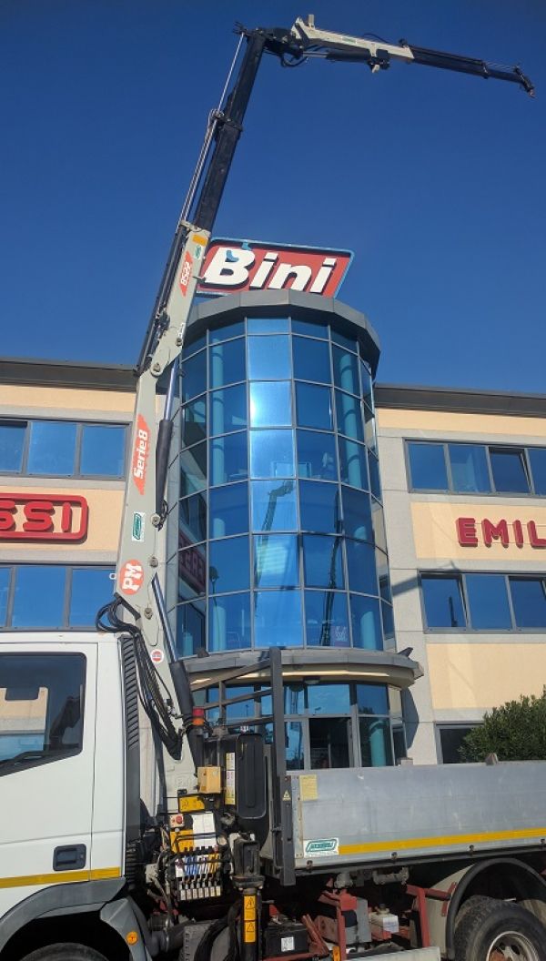 - Iveco Eurocargo 100E18K anno 2003, 40.000 km (usato pochissimo) con Gru idraulica Pm 8522 + J12 ( 2sfili di gru base e due di jib ) max sbraccio m.12,40 con 250 kg (in orizzontale) e m.15,65 con kg 800 (in verticale ), radio comando Hetronic, 4 piedi stabilizzatori, ribaltabile trilaterale dim m.3,60 x m. 2,35. Ottime condizioni generali. il tutto a norme MCTC e CE