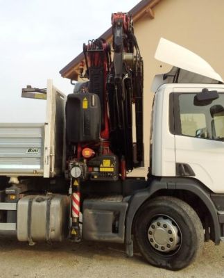 Autocarro Scania usato con gru Fassi F310 e ribaltabile