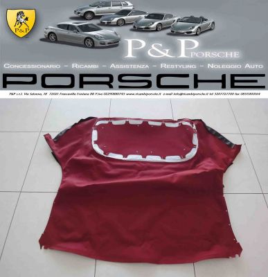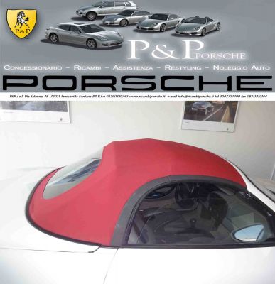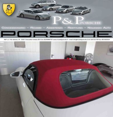 - CAPOTA PER PORSCHE BOXSTER 986 Prezzo Affare: 1050,00 euro E’ possibile effettuare il montaggio presso nostra sede al costo di 450,00 euro Le foto mostrano la capota prima e dopo il montaggio, le foto sono reali dell’oggetto in questione Abbiamo altri ricambi di questa auto * FIDATEVI DI UN’AZIENDA SPECIALIZZATA PORSCHE * inoltre Offriamo: PEZZI USATI e NUOVI ORIGINALI e NON ORIGINALI A PREZZI SUPERSCONTATI (CARROZZERIA Usato al 50% del prezzo di listino IVATO Porsche ) (MECCANICA Usato al 35% circa del prezzo di listino IVATO Porsche ) Disponibilità altri ricambi Noi realizziamo anche il restyling completo è trasformazione delle vostre auto nei modelli attuali 2011. Vendita auto PORSCHE già disponibili in casa. CARRERA 996 - 997 - 911 - CAYMAN - BOXSTER - CAYENNE - PANAMERA RITIRIAMO AUTO INCIDENTATE SINISTRATE *** NOLEGGIO AUTO PORSCHE *** PER QUALSIASI INFORMAZIONE CHIAMA AL Tel. 320 7727700 Tel. 393 9559550 Fax. 0831 1810164