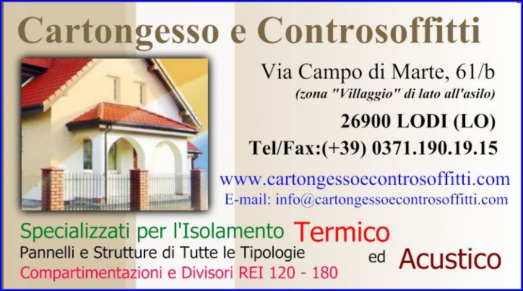 - Siamo un Centro per Controsoffitti e Finiture d'Interni, specializzati nell'isolamento Termico ed Acustico, Pareti Divisorie e Contropareti in Cartongesso, Fibro Gesso e Aquapanel (Lastre tipo cartongesso ma in Fibrocemento, ottime anche per l'esterno), Pavimenti Sopra-Elevati, Decori in Gesso pre-finiti e altro; Vente a visitarci !! Grazie dell'attenzione. Vi aspettiamo in Via Campo di Marte, 61/B a Lodi, o su http://www.cartongessoecontrosoffitti.com Operiamo a LODI e Provincia, Milano e Provincia, in tutta la Lombardia e zone limitrofe. Lunedì - Venerdi: mattino dalle 07: 30 alle 12: 30 - pomeriggio dalle 13: 30 alle 19: 00 Sabato: solo mattino dalle 08: 00 alle 12: 00 Domenica: chiuso