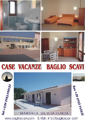 - La struttura turistica “Case Vacanze Baglio Scavi” è situata a Marsala, in provincia di Trapani, ed è lieta di inviarLe la nostra offerta di soggiorno e pernottamento. La struttura dista circa 4 chilometri dal mare (Stagnone, isola di Mozia) e 5 chilometri dal centro storico di Marsala, ed è aperta tutto l’anno. I locali sono forniti di aria condizionata, riscaldamento, TV color, biancheria letto e asciugamani bagno (che comprende l’asciugacapelli); all’esterno dei locali si trova un giardino con solarium, attrezzato con sedie, tavoli, ombrelloni e barbecue, con disponibilità posto auto privato. E’ prevista la possibilità di ospitare portatori di handicap. Le “Case Vacanze Baglio Scavi” offrono la possibilità di alternare meravigliose escursioni tra mare, isole e colline in barca, a piedi, in bici, a cavallo o ancora in canoa o catamarano.