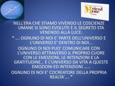 - L’Associazione Nettuno ASD Yoga Massa Italia & L’Associazione Culturale Musicalmente Presentano 3 FILMS CHE SVELANO CIO’ CHE SINO AD OGGI ERA TENUTO SEGRETO AFFINCHE’ L’UNIVERSO APPARTENESSE A POCHI…. LA SPEZIA LOCALITA’ FAVARO VIA DELLA LIBERTA’ PRESSO EX SCUOLA ELEMENTARE GIOVEDI’ 19 LUGLIO 2012 ORE 21.00 “OLOS” L'anima della terra …... SABATO 28 LUGLIO 2012 ORE 21.00 “THE SECRET” DI RHONDA BYRNE …… GIOVEDI’ 9 AGOSTO 2012 ORE 21.00 “CONVERSAZIONI CON DIO” Dal libro: Conversazioni con Dio di Neale Donald Walsch Info: segreteria tel. 349/2980661-0585621677 segreteria@yogamassa.com