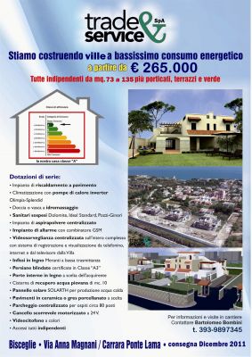 - Stiamo realizzando case a basso consumo energetico in Classe A Tutte indipendenti da 77 a 135 mq. oltre i porticati, terrazzi e verde. Dotazioni di serie: Impianto di riscaldamento a pavimento Climatizzazione con pompe di calore inverter AA+ Doccia idromassaggio bagno turco Sanitari sospesi Dolomite o Ideal Standard Impianto di aspirapolvere centralizzato Impianto di allarme con combinatore GSM Videosorveglianza centralizzata sull’intero complesso Infissi in Mogano Meranti con vetri visarm bassoemissivi Persiane blindate certificate Classe A3 Porte interne in legno a scelta dell’acquirente Cisterna di recupero acqua piovana di mc. 12 Pannello solare per produzione acqua calda Pavimenti in ceramica e gres porcellanato a scelta Parcheggio centralizzato per ospiti circa 80 posti Cancello scorrevole motorizzato a 24 V. Videocitofono a colori Accessi tutti privati Prezzi a partire da € 265.000,00 per informazioni e visite in cantiere Bartolo Bombini 393-9897345