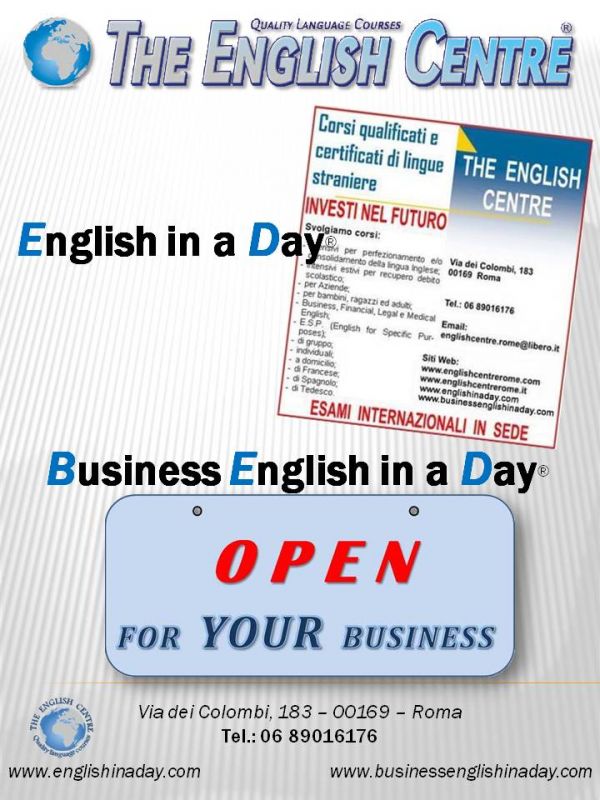 - THE ENGLISH CENTRE, Examination Centre di Trinity College London al n° 41828 e sede di esami internazionali, è un Centro Studi di Lingue Straniere che offre una ampia varietà di corsi di lingua Inglese, Francese, Spagnolo e Tedesco tenuti da insegnanti ESCLUSIVAMENTE madre lingua qualificati, certificati e specializzati nell'insegnamento della lingua straniera come seconda lingua. Offriamo corsi: - intensivi per perfezionamento e / o consolidamento della lingua Inglese; - intensivi per recupero debito scolastico; - per Aziende; - per bambini, ragazzi ed adulti; - Medical, Business, Financial e Legal English; - E.S.P. (English for Specific Purposes); - di gruppo; - individuali; - a domicilio; - corsi di Francese; - Corsi di Spagnolo; - Corsi di Tedesco. Il nostro Centro di Lingue Straniere è situato a Roma in Via dei Colombi n° 183. Per informazioni: - telefonare al n° 06 89016176 dal lunedì al venerdì dalle 10.00 alle 13.00 e dalle 16.00 alle 19.00.