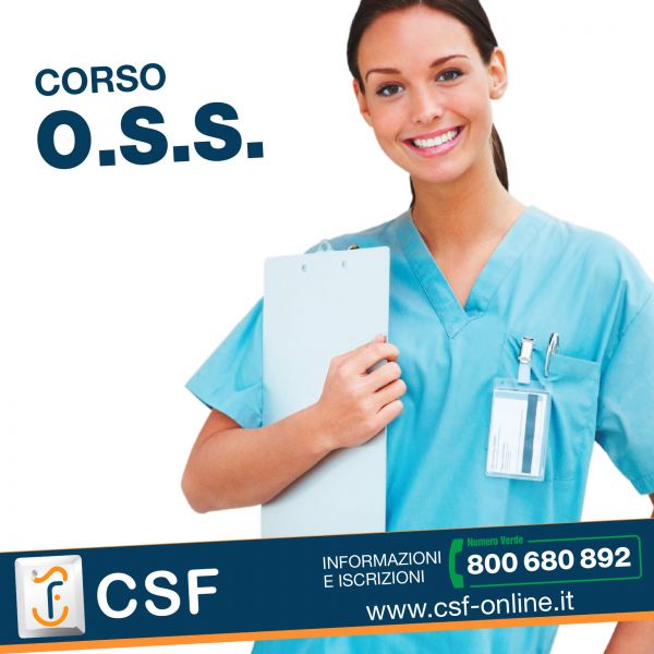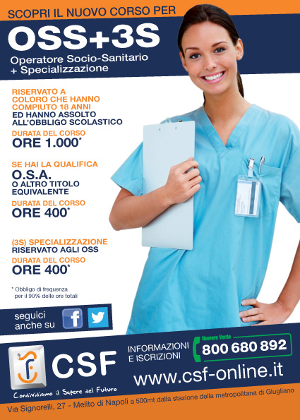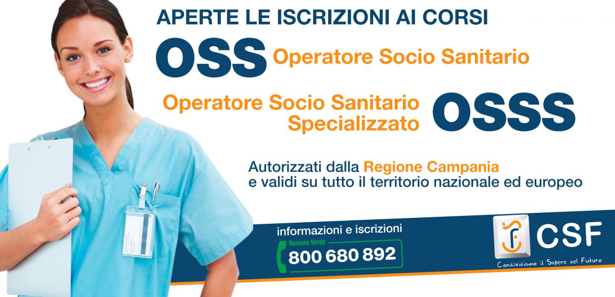 - Il CSF srl è Autorizzati dalla Regione Campania, con il Decreto Dirigenziale n. 103 del 28/03/2014 SEDE DEL CORSO: Melito di Napoli DURATA: 1.000 ore (550 ore in aula - 450 stage) - utenza privata 400 ore per persone con qualifica OSA FREQUENZA: 2 o 3 lezioni alla settimana NUMERO MASSIMO PARTECIPANTI: 15 SCADENZA ISCRIZIONI: al raggiungimento del numero massimo di partecipanti RATEIZZAZIONE: tutti i corsi CSF sono rateizzabili senza interessi per l’intera durata del corso TITOLO: qualifica professionale riconosciuta a livello nazionale ed europeo FIGURA PROFESSIONALE FORMATA Operatore Socio-Sanitario Il profilo dell’Operatore socio-sanitario (OSS) è definito dall’Accordo sancito dalla Conferenza Stato-Regioni nella seduta del 22 febbraio 2001 tra il Ministro della Sanità, il Ministro della Solidarietà, le Regioni e le Province autonome di Trento e di Bolzano. La Regione Campania ha recepito l’Accordo con D.G.R. n. 3956/2001.
