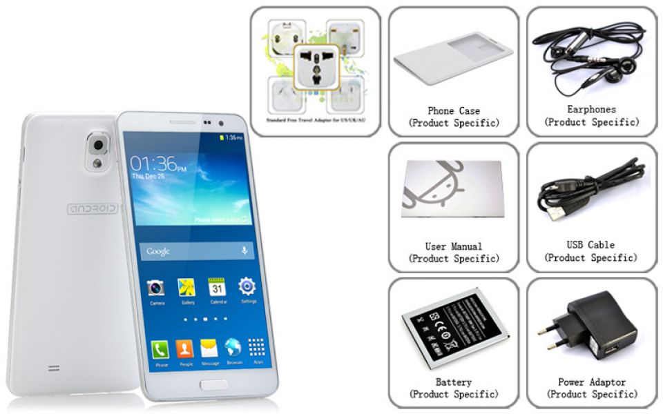 - Galaxy Note 3 Android 4.2 - Display 5.7 IPS, MTK6589 Quad Core, 13 Mp Model Note 3 Android 4.2 Jelly Bean Mobile Phone - 5.7 pollici IPS display, MTK6589 Quad Core 1.2GHz CPU, fotocamera da 13 megapixel posteriore (Bianco) Specifiche del Produttore OS Version: 4.2 CPU: MT6589 Quad Core Velocità del processore (max): 1.2GHz RAM: 1 GB 3G: WCDMA: 850/2100MHz 2G: GSM 850/900/1800/1900MHz WiFi: 802.11 b / g / n GPS Bluetooth Adobe Flash OTG Radio FM Portable WiFi Hotspot (3G Tethering) Google Play Fotocamera da 13 megapixel posteriore + 5 Megapixel, fotocamera frontale (8 megapixel interpolazione) Risoluzione video: 640x480 anteriore / posteriore 1280x720 Mic e l'altoparlante Dimensione della batteria: 3300mAh Tempo di utilizzo: da 4 a 5 ore Batteria in standby: 70 ore Lingue: Invia Email oppure telefona al: 3492367174