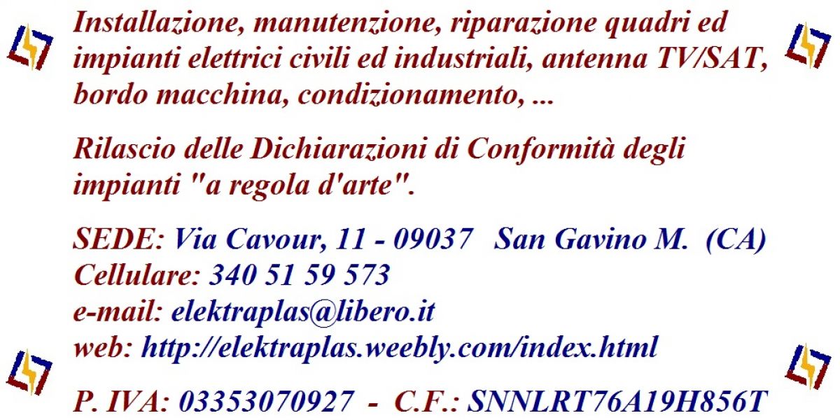 - Regolarmente iscritto alla C.C.I.A.A. di Cagliari ed all'Albo Artigiani, la Ditta Individuale Elektra P.L.A.S. di Alberto Sanna, esegue installazione, manutenzione e riparazione quadri ed impianti elettrici civili ed industriali, impianti bordo macchina, automazioni, antenne TV/SAT, ... Ai sensi delle norme CEI-UNI si rilascia la Dichiarazione di Conformità degli impianti realizzati 'a regola d'arte'. In Base al regime fiscale di vantaggio, De Minimis, l'applicazione dell'I.V.A. sulla manodopera è esente. Per maggiori info e/o preventivi, contattatemi.