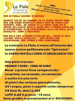 - EPICENTRO : TRATTORIA E PROMOZIONE SOCIALE VOLONTARIATO GRUGLIASCO (TORINO) Il nuovo EPICENTRO coniuga il piacere della ristorazione con l'impegno sociale CORSO FRATELLI CERVI 57 -- 10095 GRUGLIASCO (TORINO) ------------------------------------------------------------------------ In collaborazione con : LA PIOLA TRATTORIA Non solo cibo a prezzi popolari ma...spazi di vita,lavoro,nuova socialita' Uno spazio per assaporare,per vivere e per condividere primo,secondo,contorno,acqua,pane e coperto Pranzo = 7 euro Cena 10 euro Telefono : 011 3117801 ----------------------------------------------------------------------