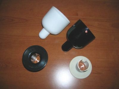 • Coppia bicchieri Iittala designer Vennola collezione Kaveri anni’80 cm.13,5 x 7,5, vetro bianco e nero, piede in plastica smontabile nero e bianco un po’ ingiallito dal tempo, vendo euro 50.