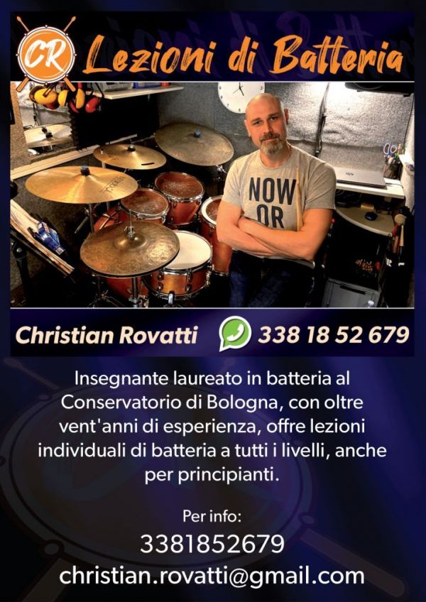 - Insegnante diplomato in Batteria e Percussioni Jazz al Conservatorio di Bologna, con laurea magistrale in Discipline della Musica (pedagogia musicale), offre lezioni individuali di batteria presso studio privato alle porte di Bologna. Anche per principianti e bambini oltre i 7 anni. Su richiesta, preparazione agli esami del Conservatorio e del liceo musicale. Garantite serietà, competenza e lunga esperienza nel campo della didattica musicale.