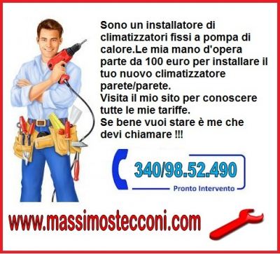 - WWW.MASSIMOSTECCONI.COM sono un installatore serio e preparato.Installo il tuo climatizzatore con mano d'opera a partire da 100 euro.Prima di mettere mano al telefono guarda il mio portale per conoscere subito tutte le mie tariffe.Se bene vuoi stare è me che devi chiamare!!!!Massimo Stecconi Guarda il mio portale !!!!!