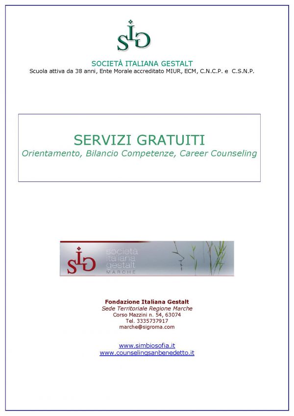 - SERVIZI GRATUITI Orientamento, Bilancio Competenze, Career Counseling Il percorso di orientamento rappresenta uno strumento di analisi, esplorazione e valutazione della situazione attuale e potenziale del soggetto che vi partecipa. Esso prende in considerazione tutte le variabili rilevanti dal punto di vista sia personale che professionale nell'ottica dell'individuazione del settore di impiego preferenziale dei partecipanti e delle loro potenzialità inespresse. Il percorso si conclude con la stesura di un profilo dominante e con l'elaborazione di un progetto personale e professionale che incrementa la capacità di scelta e favorisce l'empowerment della persona al fine di definire un obiettivo professionale reale, concreto e comunicabile. Obiettivo primario dell’orientamento, infatti, è fornire una cassetta degli attrezzi che comprenda competenze di scelta, capacità di cercare, valutare e selezionare informazioni, autostima ed empowerment ricorrente, capacità di analisi di sé, dei p