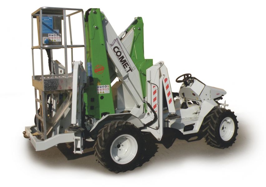 - Piattaforma aerea 12 metri su trattore 4x4,Altezza di lavoro 12 m, Sbraccio laterale 4.5 m, Altezza scavalcamento 5 m, Altezza piano di calpestio navicella 10 m, Portata in navicella 150 kg (n. 1 persona), Stabilizzatori idraulici n. 4 a pantografo, Rotazione 360° , Dimensioni navicella in alluminio: 800x650x1100 mm, comandi idraulici che rendono possibili 2 movimenti contemporaneamente, Livellamento automatico della navicella continuo e graduale con circuito idraulico indipendente , Accensione e spegnimento motore del veicolo dalla navicella, Spia di centraggio braccio in posizione di riposo, Presa elettrica 220 V in navicella con presa di derivazione in torretta, Attacco aria compressa con derivazione in torretta, Barra rompitratta con chiusura a gravità, Fermapiede h 15 cm, N. 1 attacchi per cinture di sicurezza, Scalette per facilitare l’accesso in navicella. Il tutto montato e collaudato Mctc e Ce su: Trattore con snodo centrale ±15°,Motore: Yanmar L100-N6 Series - Cilindro sing