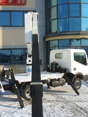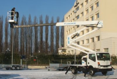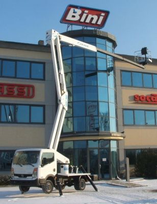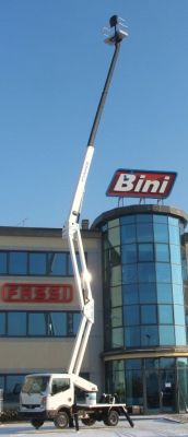 - Piattaforma aerea Socage , con doppia articolazione e braccio telescopico a uno sfilo. Cestello portapersone in alluminio, applicato all'estremità del braccio telescopico, con sistema di livellamento automatico completamente idraulico,tubazioni interne. Installabile su autocarro da t 3,5 di peso complessivo, passo 2900 mm, con n.4 stabilizzatori idraulici a discesa diretta. CARATTERISTICHE TECNICHE: H. max di lavoro m 23,70; H piano di calpestio m 21,70; sbraccio max di lavoro m 11; rotazione torretta continua; portata Max Cestello kg 200; dimensioni cestello mm 1400x700x1000, comandi Idraulici, presa Elettrica 230 V nel Cesto, rotazione Cestello 60° + 60°, dispositivo anticollisione cabina-cesto, piano di calpestio allungato. Info e schede tecniche sul sito http://www.binigru.it
