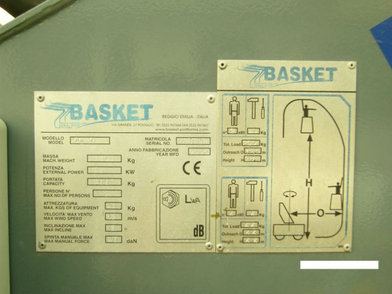 - Piattaforma aerea cingolata , Basket RQG30 (30 metri) anno 2005 ,telescopica con Jib, ore lavoro 2055 massimo sbraccio m. 13, portata max 200kg, larghezza mm 1400, peso kg 6200, pendenza superabile 40%, dim. Navicella 1.80x0.80x1.10 m. Motore Hatz, elettropompa 220/380 Volts. Ottime condizioni generali, documentazione CE e Ausl regolari. Altre info e schede tecniche sul sito www.binigru.it