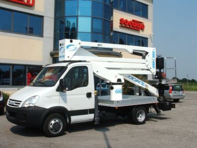 - Piattaforma aerea Socage , con doppia articolazione e braccio telescopico a uno sfilo. Cestello portapersone in alluminio, applicato all'estremità del braccio telescopico, con sistema di livellamento automatico completamente idraulico,tubazioni interne. Installabile su autocarro da t 3,5 di peso complessivo,passo 2900 mm, con n.4 stabilizzatori idraulici a discesa diretta. CARATTERISTICHE TECNICHE: H Max di lavoro m 20,00; H piano di calpestio m 18,00; Sbraccio Max di lavoro m 9,20; Rotazione Torretta Continua; Portata Max Cestello kg 200; Dimensioni cestello mm 1400x700x1000, Comandi Idraulici, Presa Elettrica 230 V nel Cesto, Rotazione Cestello 60° + 60°, sistema anticollisione cabina-cesto, piano di calpestio allungato. Il tutto su Iveco Daily 35C11 ruota gemellata altre info e schede tecniche sul sito http://www.binigru.it/template.php?pag=10115