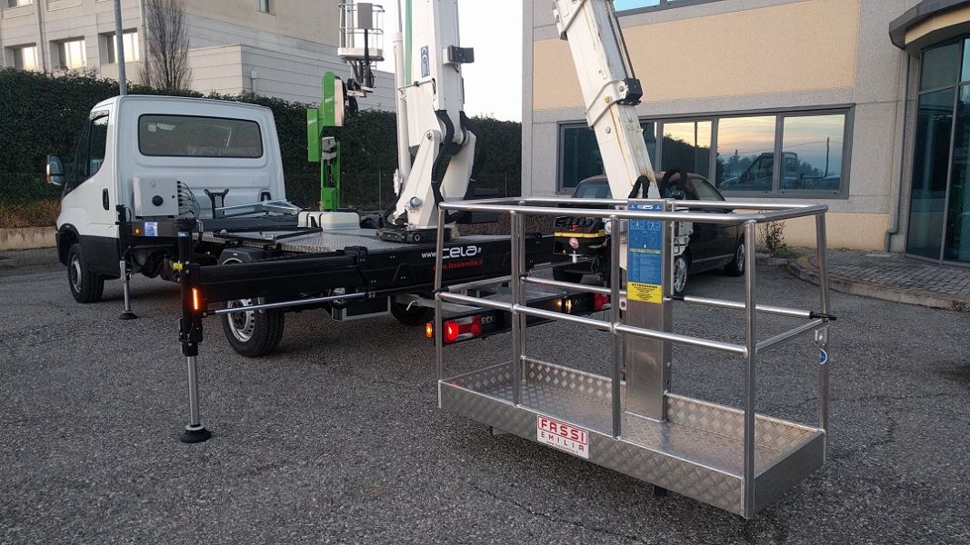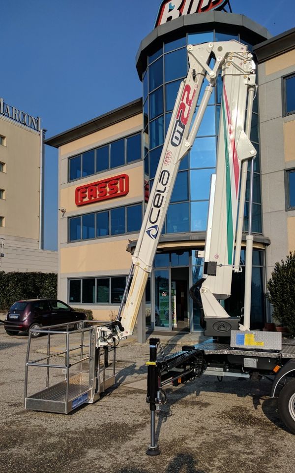 - Piattaforma aerea CELA DT 22 con doppio braccio telescopico, altezza massima di lavoro mt. 22,00, sbraccio massimo mt. 9,50 con 230 kg con traverse estese e non, punto di snodo a 14 metri. Comandi elettroidraulici proporzionali compensati con flow sharing, pompa d'emergenza manuale, rotazione torretta continua. Cestello standard di dimensioni 1400 x 700 x 1100 mm., presa 230 V., rotazione cestello 90°+90°, comandi a controllo elettronico, piano di calpestio in lamiera antisdrucciolevole, comando in cesto per avvisatore acustico e avvio e spegnimento motore autocarro .Teleassistenza con modem GSM,stabilizzazione automatica, lavoro sotto il piano stradale fino a 3 metri,Pianale con sponde in alluminio opzionale. DOCUMENTAZIONE IDONEA PER SBARCO IN QUOTA, E OMOLOGAZIONE PER UTILIZZO CON GANCIO DI SOLLEVAMENTO Possibilità del cestello da mm 1800, 1400 e/o 700 Info e schede tecniche sul sito
