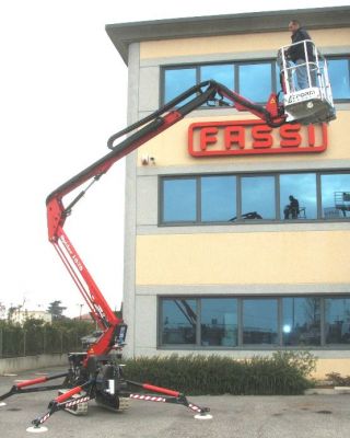 - Piattaforma aerea cingolata, con articolazione e braccio telescopico ad uno sfilo + jib., cestello portapersone in alluminio applicato all'estremità del jib, con sistema di livellamento automatico completamente idraulico, controllo dinamico automatico dello sbraccio da 80 a 200 kg.; motore termico a benzina monocilindrico Honda, carro allargabile, elettropompa 220 V, linea aria/acqua e linea 220 V. in navicella, n.4 stabilizzatori idraulici a discesa diretta. CARATTERISTICHE TECNICHE: H max di lavoro m 15,00; H piano di calpestio m 13,00; sbraccio max di lavoro m 8,50; angolo di rotazione torretta 360°; portata max navicella kg 200; dimensioni cestello mm 1200 x 665, lunghezza richiusa mm. 4920, senza navicella mm. 4250, larghezza minima richiusa mm. 780, altezza minima richiusa mm 1950, ingombro stabilizzazione mm 3100 x 3700, peso totale kg. 1900 Schede tecniche sul sito