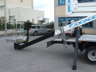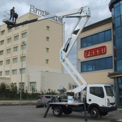 - Piattaforma aerea Socage , con doppia articolazione e braccio telescopico a uno sfilo. Cestello portapersone in alluminio, applicato all'estremità del braccio telescopico, con sistema di livellamento automatico completamente idraulico,tubazioni interne. Installabile su autocarro da t 3,5 di peso complessivo,passo 2900 mm, con n.4 stabilizzatori idraulici a discesa diretta. CARATTERISTICHE TECNICHE: H Max di lavoro m 20,00; H piano di calpestio m 18,00; Sbraccio Max di lavoro m 9,20; Rotazione Torretta Continua; Portata Max Cestello kg 200; Dimensioni cestello mm 1400x700x1000, Comandi Idraulici, Presa Elettrica 230 V nel Cesto, Rotazione Cestello 60° + 60°, sistema anticollisione cabina-cesto, piano di calpestio allungato. Possibilità di avere la versione Bassa, altezza a macchina chiusa di soli 2450 mm Altre info e schede tecniche sul sito http://www.binigru.it/template.php?pag=10115
