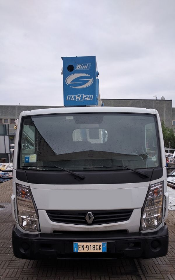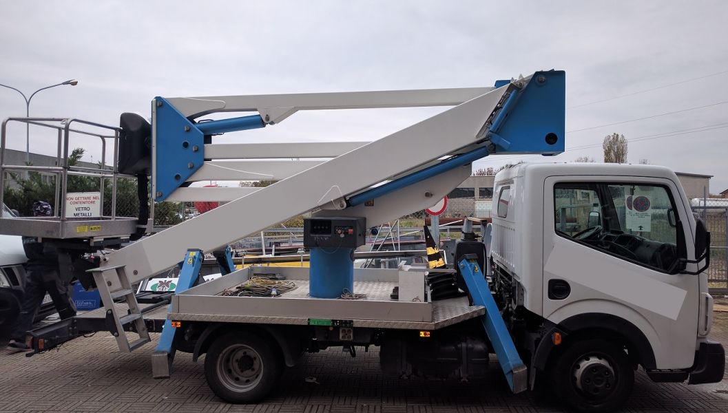 - Piattaforma aerea Socage usata mod. Apache DA 324 a doppia articolazione con pantografo, montata su Renault Maxity, altezza massima di lavoro mt. 23,70, sbraccio massimo mt. 11. Comandi idraulici da cestello, pompa d'emergenza manuale, rotazione torretta continua. Cestello standard di dimensioni 1400 x 700 x 1150 mm., presa 220 V., rotazione cestello 60°+60°, presa elettrica 230 V nel cesto, dispositivo anticollisione cabina-cesto, piano di calpestio allungato, comando in cesto per avvisatore acustico e avvio e spegnimento motore autocarro. Limitatore anti ribaltamento a doppia sicurezza. Pianale con sponde in alluminio. Il tutto su autocarro Renault Maxity anno 2013 km 40.000, il tutto collaudato MCTC e CE Come nuova