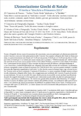 - Poesia e dintorni Cresce l’attesa del libro dell’Associazione Giochi di Natale. Le Opere degli Autori, oltre che far parte della preziosa collana, giunta alla nona edizione, saranno valutate da un’eterogenea giuria, guidata, l’anno scorso, dalla Preside Dott. Angela Procaccini. Per accedere all’appassionata schiera di amanti di questa pregevole forma d’Arte e ambire inoltre ai premi posti in palio, inviare una propria composizione. Il tema è libero con sezione speciale dedicata all’Uomo, in tutte le sue sfaccettature. Anche la Fotografia, elevata al valore culturale che diffonde, poiché fa presa diretta sulla mente e sul cuore dell’osservatore, ha un posto rilevante nelle attività dell’AssGN. Il quinto Concorso è intitolato “ Tracce del passato” ove gli Autori si cimentano con il tema affascinante della memoria che porta alle origini, ma sconfina nel presente, perché l’Uomo senza passato è un Uomo senza futuro. www.giochidinatale info@giochidinatale.it Facebook : Giochi di Natale
