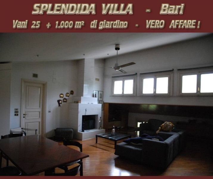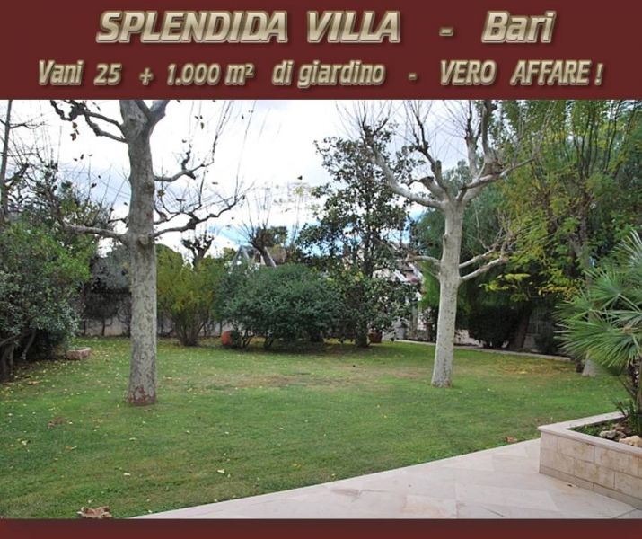 - Privato vende a Bari ( Carrassi - Poggiofranco ), SPLENDIDA VILLA immersa dal verde e Dotata di ogni confort, con rifiniture di pregio. La proprietà si sviluppa su una superficie di 800 m2 + 1.000 m2 di splendido giardino superattrezzato, con prato inglese immerso nel verde. 25 vani totali. Per le sue peculiarità di prestigio,riservatezza e bellezza, la villa si presta ottimamente come LOCATION DI ALTA RAPPRESENTANZA o Attività imprenditoriali di grido nazionali ed internazionali. La villa si sviluppa su 3 livelli con finiture ricercate ed in ottimo stato di manutenzione. Si distinguono la qualità e la pregiatezza dei materiali e dei rivestimenti, sia interni che esterni. La posizione in zona tranquilla e le numerose caratteristiche di pregio conferiscono all’immobile ottime potenzialità e valore aggiunto. COSTO: 2.800.000,00 €. Astenersi Agenzie, Intermediari, Curiosi , Perditempo, Sognatori. CONTATTI Tel: 380 - 580 73 09 Mail: immobile1-montele@libero.it