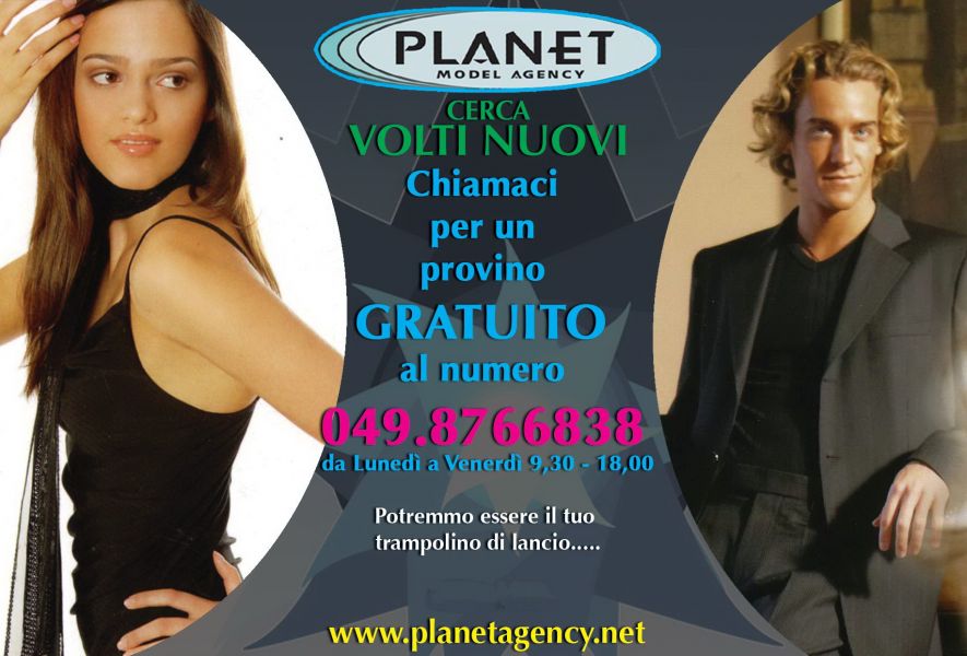 - Planet Model Agency cerca in tutto il territorio nazionale modelle, indossatrici, attrici, volti nuovi anche senza esperienza, 14-45 anni ambo i sessi, per shooting brand moda, fotocataloghi, fotocartellonistica pubblicitaria, servizi fotografici per riviste, sfilate moda, spot pubblicitari tv, videoclip musicali. I provini si tengono a Padova e sono GRATUITI. Per i minorenni necessità la presenza di un genitore. Non vendiamo CORSI. Invitiamo a scriverci solo persone motivate. Per candidarsi e essere ricontattati inviare dati anagrafici e recapito telefonico