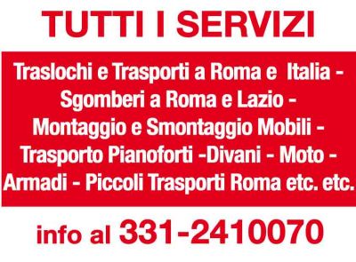 - DITTA TRASPORTI CON SEDE IN ROMA ESEGUE TRASLOCHI. TRASPORTI E SGOMBERI SU ROMA, PROVINCIA E TUTTA ITALIA. ESEGUIAMO: -TRASLOCHI E TRASPORTI GRANDI E PICCOLI -SGOMBERI DI ABITAZIONI, CANTINE, BOX, UFFICI, NEGOZI, SOFFITTE, CAPANNONI etc. -TRASPORTO PIANOFORTI, ARMADI, DIVANI,LIBRERIE etc. -MONTAGGIO MOBILI ED ARREDI -TRASLOCO STUDENTI Per informazioni: Sig.ra EMANUELA cell: 331.2410070 - 392.0661574 SKYPE: Trasglobal e-mail: trasglobal@gmail.com
