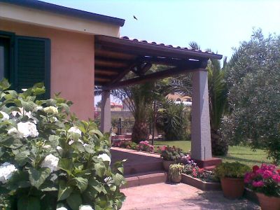 - Bellissima casa vacanza in villa con giardino, a due passi dal mare, composto di due camere, soggiorno, cucina, bagno, dispensa, disimpegno, giardino e una grande veranda in cui si possono consumare i pasti all'aperto. A fianco della casa ci sono i giardini delle case confinanti, davanti alla veranda lo spazio intorno è assolutamente verde e libero da costruzioni fino alla pineta antistante il mare. Nel raggio di pochi km., si possono raggiungere una trentina di spiagge, tutte bellissime. L'appartamento è nuovo, spazioso, la casa è circondata da un ampio giardino, ci sono alberi con panchine, il barbecue, tavolo e sedie in ferro battuto dove è possibile cenare tra l'erbetta e i fiori.