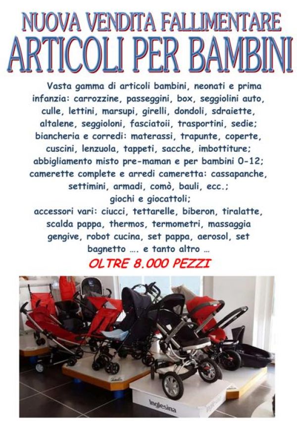 - Importante stock articoli per neonati e prima infanzia: carrozzine, passeggini, seggiolini auto, culle e lettini, marsupi, girelli, altalene, seggioloni, fasciatoi, camerette complete; biancheria e corredi: trapunte, coperte, cuscini, lenzuola; abbigliamento misto pre-maman e per bambini 0-12 anni; giochi e giocattoli; accessori vari come ciucci, tettarelle, biberon, thermos, termometri, massaggia gengive, set pappa, aerosol, set bagnetto e tanto altro ancora totale: oltre 8.000 pezzi per info su prezzo ed altro contattare: BOBBI LUCA 328 8535881 o 0744 800948
