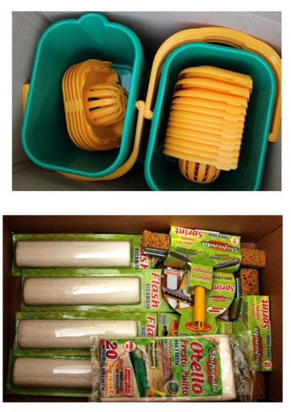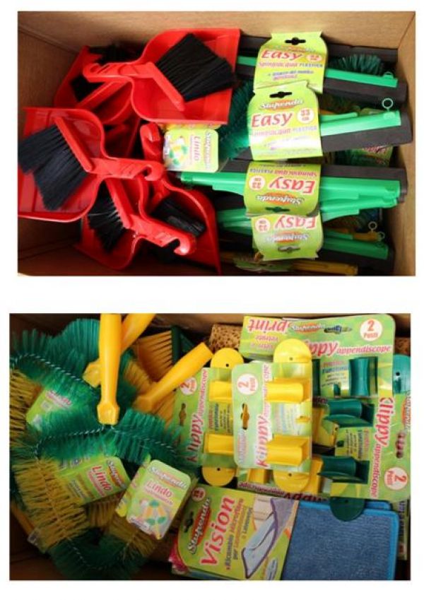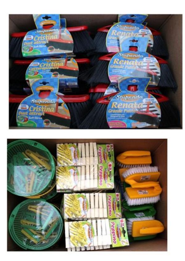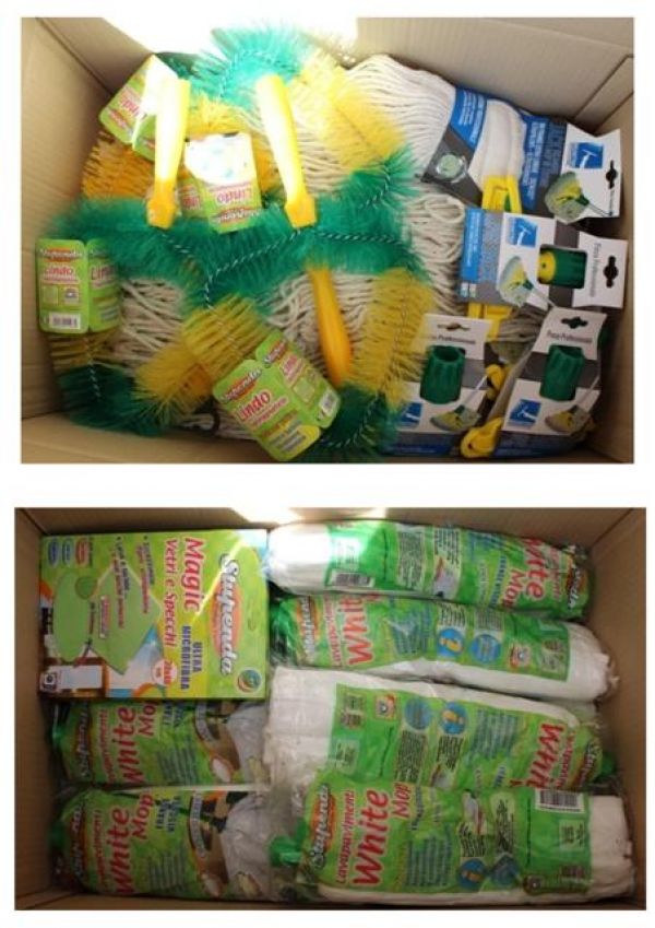 - Stock articoli pulizia per la casa: scope per interni ed esterni, spazzole per pavimenti, spugne, panni microfibra, mop, spatole lavavetri, strizzatori, secchi, attrezzi con manico, mocho, ragnatori, alzaimmondizia, manici telescopici, guanti, cestelli, spingi acqua, mollette, spazzole da bucato, grucce e tanto altro ancora!!! Totale pezzi 45.000 visibile presso i nostri magazzini. Per info contattare Bobbi Luca +39 3288535881 o uff. 0744 800948