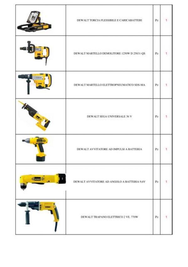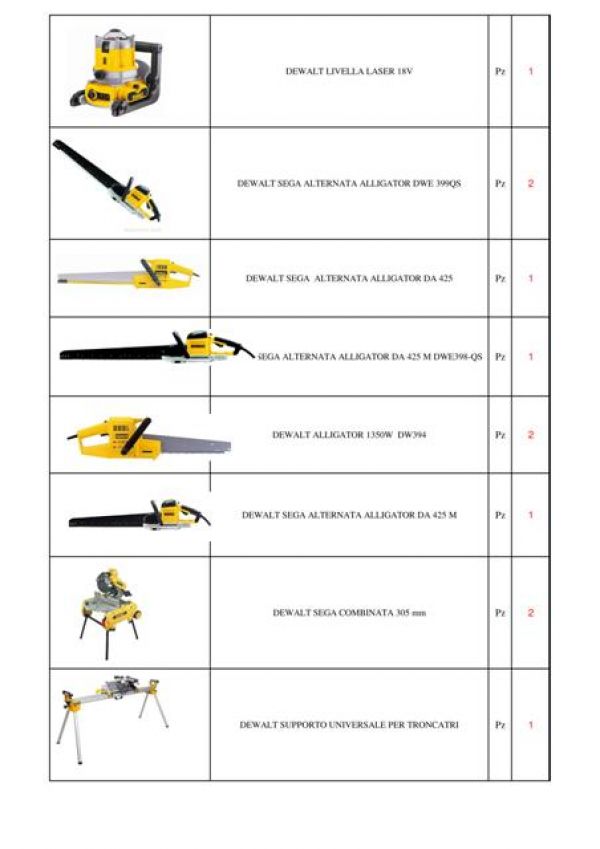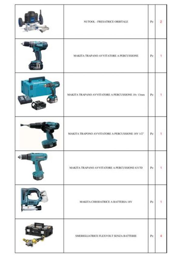 - Stock di elettroutensili marca Dewalt, Stanley, Kress e Makita come martello demolitore, seghetto alternativo, sega circolare, trapano, avvitatori, elettrofresatrice, livella laser e tanto ancora per un totale di 66 pezzi. Per informazioni e trattative per prezzo in blocco contattare il Sig. Bobbi Luca al 328.8535881 o 0744.800948.