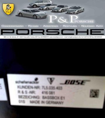 - Offriamo: Fantastico ed introvabile SUBWOOFER BOSE originale Porsche Cayenne PREZZO AFFARE: 350,00 euro completo di cassa e della sua centralina OTTIMO SU TUTTI I MODELLI CAYENNE le foto sono reali degli oggetti in questione Questi pezzi sono usati ma in ottime condizioni, Possibilità di montaggio presso nostra sede Abbiamo altri ricambi di questa auto * FIDATEVI DI UNAZIENDA SPECIALIZZATA PORSCHE * inoltre Offriamo: PEZZI USATI e NUOVI ORIGINALI e NON ORIGINALI A PREZZI SUPERSCONTATI (CARROZZERIA Usato al 50% del prezzo di listino IVATO Porsche ) (MECCANICA Usato al 35% circa del prezzo di listino IVATO Porsche ) Vendita auto PORSCHE già disponibili in casa. *** NOLEGGIO AUTO PORSCHE *** PER QUALSIASI INFORMAZIONE CHIAMA AL Tel. 320 7727700 Tel. 393 9559550 Fax. 0831 1810164 Visitate il nostro sito: www.ricambiporsche.it o mandaci un e-mail: info@ricambiporsche.it
