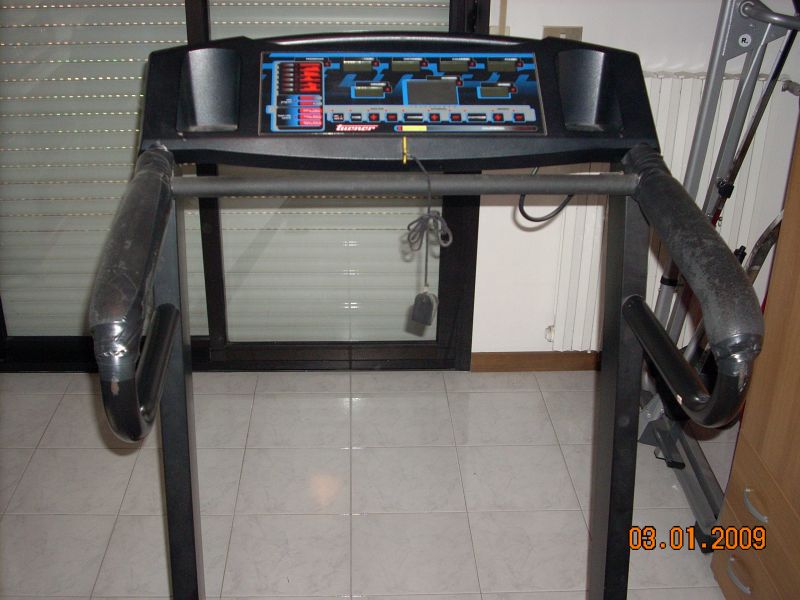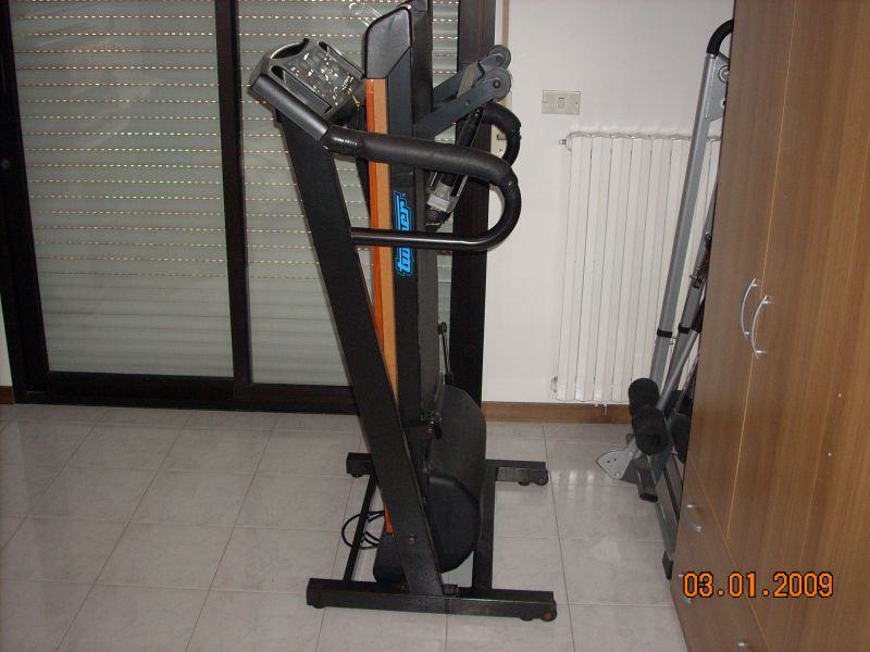 - TAPIS ROULANT CALIFORNIA 1500. Console di comando con 11 programmi di cui 1 manuale, 5 a profilo, 2 personalizzabili, 3 cardio fitness con controllo dello sforzo in base alla frequenza cardiaca e possibilità di pre-impostare: distanza, tempo e calorie. tutti i programmi prevedono sia la variazione della velocità, che l'inclinazione del piano di corsa che è elettro assistita. Motore da 1,5 HP. Centralina digitale. Velocità variabile da 09 a 16 Km. Regolazione elettrica dell'inclinazione del piano di corsa 0° 12°, piano di corsa ammortizzato. Fasie laterali in legno, struttura richiudibile. Consolle di comando a 7 display a cristalli liquidi, con indicazioni di: velocità, tempo, distanza, stima delle calorie bruciate,frequenza cardiaca, inclinazione, profilo del programma in esecuzione e fase in corso. Chiave di sicurezza per lo spegnimento in caso di emergenza. Completo di libretto di istruzioni. Usato pochissimo...peccato...ma la mia età non lo permette piu'. E' un bellissimo attrezzo