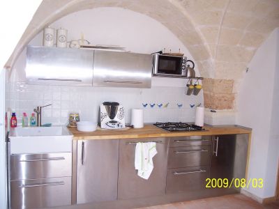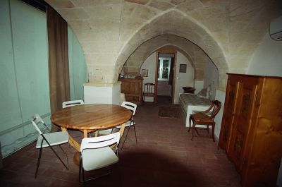 - Nella masseria(8000mq di terreno) ci sono 3 fabbricati indipendenti . questo veniva utilizzato per i greggi di pecore. Restaurato, sul lato frontale è stata applicata una grande vetrata (9mx2,60) per valorizzare la muratura frontale, con grandi tende esterne per proteggerla dal calore del sole e tende interne in iuta per la privacy. nell'interno sono stati mantenuti i soffitti con volte a stella in tufo a vista; i pavimenti sono in cotto.Da tale edificio sono stati ricavati : -3 vani comunicanti, per la cucina, la zona pranzo e il soggiorno (con divano/letto a due posti); - bagno con doccia -camera con letto matrimoniale,armadio a muro e 2' bagno di servizio. 2 condizionatori/pompe di calore e cassaforte. Adatto a una famiglia di 4 persone, o due coppie che condividano la cucina e la zona pranzo. Davanti a tale edificio è stata ricavata unarea con ombrellone da sole , tavolo e sedie in legno. disponibili per tutti un campo da tennis ,ed un grande gazebo coperto in legno