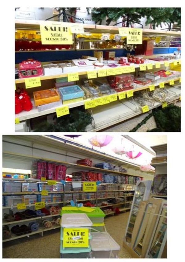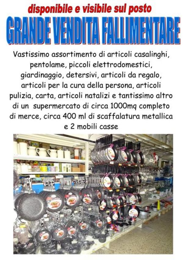 - Vendita fallimentare in blocco di un supermercato di 1000 mq completo di merci: detersivi e articoli pulizia casa, arredo casa, prodotti per la cura della persona, casalinghi, vetro e ceramica, pentolame, accessori cucina, piccoli elettrodomestici, articoli da regalo, giardinaggio, carta e monouso per la tavola, articoli per animali, accessori auto, articoli natalizi, cancelleria e giochi bambini, oggettistica e tantissimo altro oltre a circa 400 ml di scaffalature metalliche e due mobili cassa. Merce e scaffalature vendibili anche in due lotti separati. Per info e prezzo contattare Bobbi Luca +39 3288535881 o uff. 0744800948