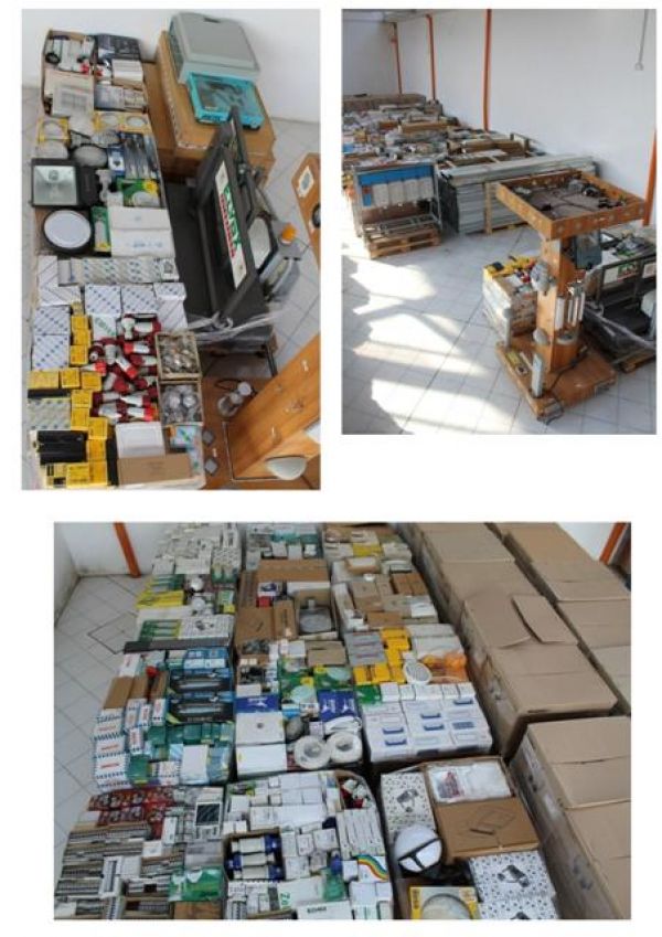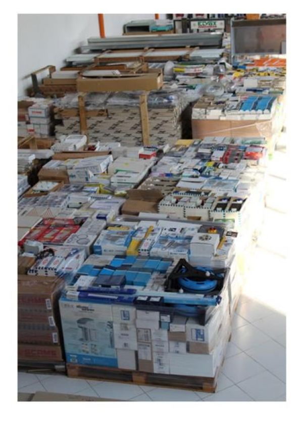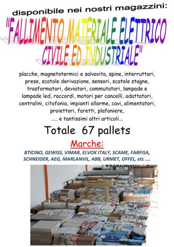 - Stock materiale elettrico civile e industriale: placche, relè, spine, interruttori, prese, scatole derivazione, sensori, fusibili infrarossi, scatole stagne, trasformatori, deviatori, commutatori, lampade, raccordi, adattatori, morsetteria, centralini, condensatori, luminarie, cavi varie sezioni e misure, alimentatori, aspiratori, plafoniere, termoconvettori, ventilatori e tantissimi altri articoli. Alcuni esempi di marche: Bticino, Schneider, Gewiss, Vimar, Orieme, Urmet, Vortice, Finder, Weber, Schyller Totale 67 pallets Per info su prezzo ed altro contattare il Sig. BOBBI LUCA al 328/8535881 o i nostri uffici allo 0744/800948
