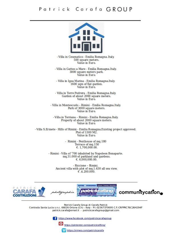 - Patrick Carafa Construction è il progetto di Patrick Carafa Group nell'edilizia. L'offerta dell'azienda spazia tra i differenti settori dell'ambito edile rivolgendosi agli stakeholder e non del campo,perchè le attività finalizzate allo stesso sono dedicate a privati ed aziende che vogliono avvalersi di esperienza,conoscenza e competenza. Novità di Patrick Carafa Construction sono la bioedilizia e le ristrutturazioni ed è specializzata nella gestione immobiliare,nonchè nel 'chiavi in mano' occupandosi degli studi preliminari di fattibilita' e dell'acquisizione,della progettazione e della costruzione,delle rifiniture e della consegna.