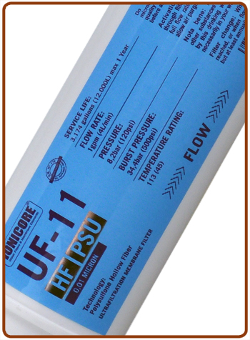 - Ultrafiltration is a system which separates water particles between reverse osmosis and microfiltration. It can be described as synthetic membrane filtration which is used to separate various macromolecules, colloids, viruses and bacteria. It operates at low pressures in comparison to reverse osmosis, almost without causing any alterations to the water mineralization. The Ionicore UF ultrafiltration membrane is produced with polysulphone capillaries, allowing water to pass from outside to inside without rejection, with nominal filtration at 0,01 microns and a maximum recommended flow of 4 lt/min. The average useful life of the system is 12.000 litres or one year, if water used is dechlorinated and with pre-filter. The recommended work pressure for the membrane is between 0,5 and 8,2 bars. * We provide only businesses companies such as distributors, retailers, manufacturers and assemblers.